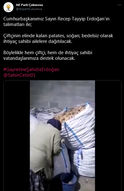 Paylaşılan videoda, patates üreticisi bir kadının, “Patatesimiz çöpe gidecekti, fakir fukaranın ekmeğini verdi Cumhurbaşkanımız. Patateslerimiz hep çöp idi yoksa. Kimse yüzüne bakmıyordu tüccarlardan. Gelen 1,50 lira verip gidiyordu. Cumhurbaşkanımız imdadımıza yetişti. Allah ondan razı olsun” sözleri duyuluyor.