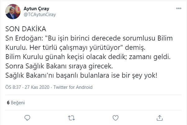 İYİ Parti İzmir Milletvekili Aytun Çıray, AKP'li Cumhurbaşkanı Recep Tayyip Erdoğan'ın salgına ilişkin, "Bu işin birinci derecede sorumlusu Bilim Kurulu. Her türlü çalışmayı yürütüyor" şeklindeki sözlerine dikkat çekti.