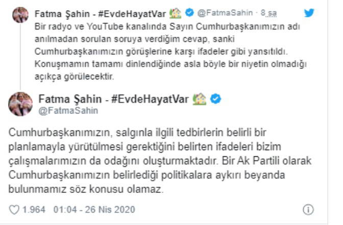 Cumhurbaşkanımızın, salgınla ilgili tedbirlerin belirli bir planlamayla yürütülmesi gerektiğini belirten ifadeleri bizim çalışmalarımızın da odağını oluşturmaktadır. Bir Ak Partili olarak Cumhurbaşkanımızın belirlediği politikalara aykırı beyanda bulunmamız söz konusu olamaz."