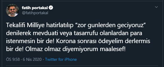 "Tekalifi Milliye hatırlatılıp “zor günlerden geçiyoruz” denilerek mevduatı veya tasarrufu olanlardan para istenmesin bir de! Korona sonrası ödeyelim derlermiş bir de! Olmaz olmaz diyemiyorum maalesef"