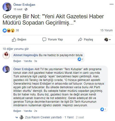 “Akit TV’de yayınlanan ‘Ters Kutuplar’ adlı programa konuk olan Akit gazetesi haber müdürü Murat Alan’ın canlı yayında Türk askeriyle ilgili yaptığı ‘eşek’ benzetmesi tepki çekmişti. Alan, gazeteci Ali Tarakçı ile tartıştığı sırada, ‘O hizaya gelmeyen apoletli Generalleriniz hepsi Erdoğan’ın arkasında saf tutuyor. Oynaya oynaya eşşek gibi saf tutacaklar. Bu ülkede demokrasi varsa bunu AK Parti iktidarı oturttu’ demişti. Bu sebeple haber müdürü sopadan geçirilmiş. Bu bir haber notu. Bunu biz, gazeteci lisanı ile değil ancak kendi edebiyat sanatı lisanımız ile not edebiliriz. Gerek edebiyat dili ve gerekse Türkçe deyimler/kavramları ile ilgili Dil Tarih Kurumunun imkânlarını kullanmak öğretici olabilir. Hepinizi seviyorum.”