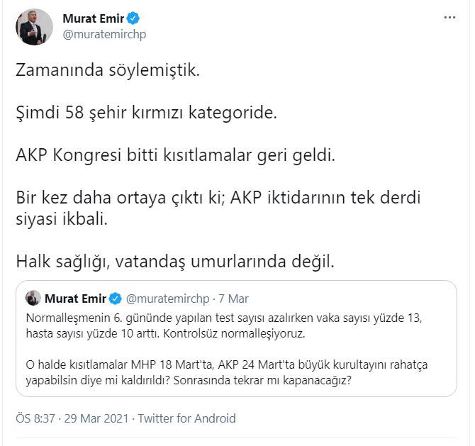 CHP Ankara Milletvekili Murat Emir, ''Zamanında söylemiştik. Şimdi 58 şehir kırmızı kategoride. AKP Kongresi bitti kısıtlamalar geri geldi. Bir kez daha ortaya çıktı ki; AKP iktidarının tek derdi siyasi ikbali. Halk sağlığı, vatandaş umurlarında değil'' dedi.