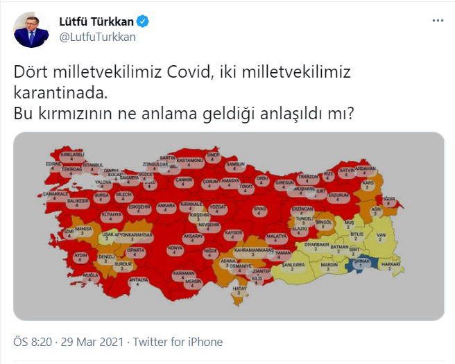 İYİ Parti Grup Başkan Vekili Lütfü Türkkan, ''Dört milletvekilimiz Covid, iki milletvekilimiz karantinada. Bu kırmızının ne anlama geldiği anlaşıldı mı?'' diye sordu.