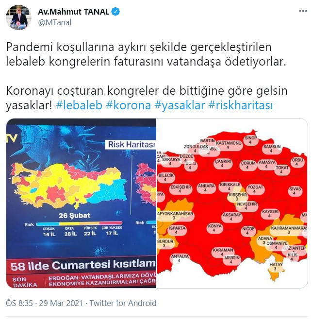 CHP İstanbul Milletvekili Mahmut Tanal, ''Pandemi koşullarına aykırı şekilde gerçekleştirilen lebaleb kongrelerin faturasını vatandaşa ödetiyorlar. Koronayı coşturan kongreler de bittiğine göre gelsin yasaklar'' ifadelerini kullandı.