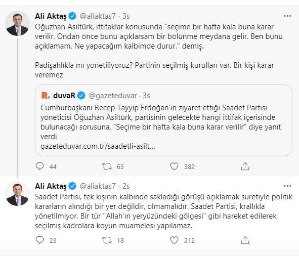 ''Oğuzhan Asiltürk, ittifaklar konusunda 'seçime bir hafta kala buna karar verilir. Ondan önce bunu açıklarsam bir bölünme meydana gelir. Ben bunu açıklamam. Ne yapacağım kalbimde durur' demiş. Padişahlıkla mı yönetiliyoruz? Partinin seçilmiş kurulları var. Bir kişi karar veremez. Saadet Partisi, tek kişinin kalbinde sakladığı görüşü açıklamak suretiyle politik kararların alındığı bir yer değildir, olmamalıdır. Saadet Partisi, krallıkla yönetilmiyor. Bir tür 'Allah'ın yeryüzündeki gölgesi' gibi hareket edilerek seçilmiş kadrolara koyun muamelesi yapılamaz.''