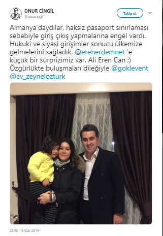 "Almanya’daydılar, haksız pasaport sınırlaması sebebiyle giriş çıkış yapmalarına engel vardı. Hukuki ve siyasi girişimler sonucu ülkemize gelmelerini sağladık. @erenerdemnet ‘e küçük bir sürprizimiz var. Ali Eren Can ;) Özgürlükte buluşmaları dileğiyle."