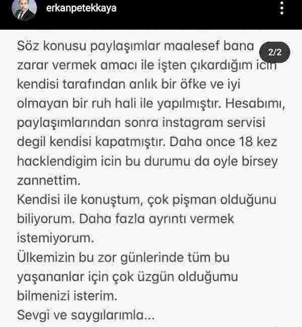 Petekkaya bir süre yeniden açılan Instagram hesabından, yaptığı açıklamada söz konusu tweetleri kendisinin atmadığını söyledi. Hesabının daha önce 18 kez hacklendiğini, ilk başta yine benzer bir durumun yaşandığını sandıklarını belirten Petekkaya, yaptıkları araştırmada, söz konusu tweetleri bir süre önce işine son verdiği yardımcısının attığını tespit ettiklerini belirtti.