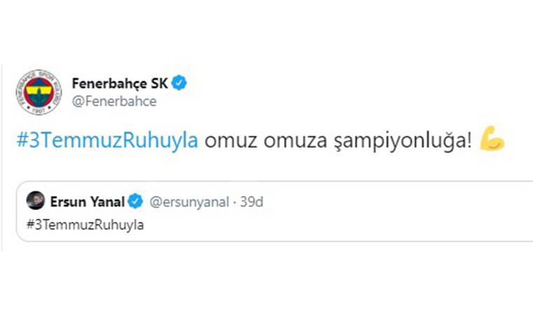 Ersun Yanal, sosyal medya hesabı twitterdan 3 Temmuz ruhuyla ilgili hastag yayınladı, mesajı verdi. Takım kaptanı Ozan Tufan da aynı mesajı kullandı