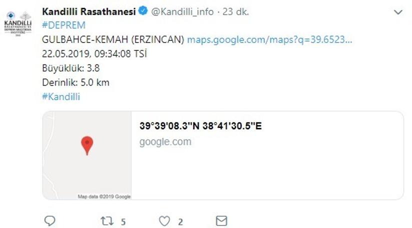 Kandilli Rasathanesi'nden yapılan açıklamaya göre Erzincan'da saat 09:34'te 3.8 büyüklüğünde deprem oldu.