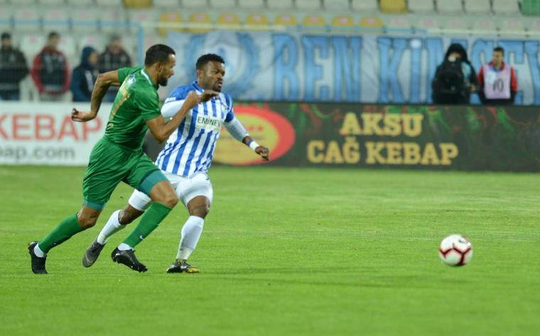 26. dakikada gelişen Büyükşehir Belediye Erzurumspor atağında Eduok, ceza sahası önünde oldukça sert bir vuruş yaparken, meşin yuvarlak üsten auta gitti.
