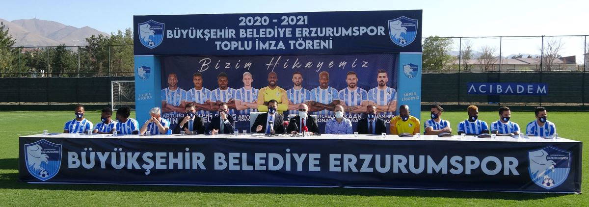 BB Erzurumspor'un yeni transferleri için imza töreni, kulüp tesislerinde düzenlendi. Büyükşehir Belediye Başkanı ve Kulüp Onursal Başkanı Mehmet Sekmen, mavi beyazlı kulübün başkanı Hüseyin Üneş, yöneticiler ve futbolcular pandemi tedbirleriyle bir araya geldi. Antrenman sahası ortasına kurulan platformda 9 yeni futbolcuya tek tek imza attıran kulüp başkanı Hüseyin Üneş, "Geçtiğimiz sezon takıma çok ciddi katkılar sağlayan ve sözleşmesi biten 5 futbolcuyla sözleşme uzattık. Transfer döneminde 9 yeni futbolcuyu da takıma kazandırdık. Kale dahil olmak üzere birçok bölgeye yeni transfer yaparak takımı güçlendirdik. Yeni sezonda takıma çok ciddi katkı sağlayacaklar" dedi.