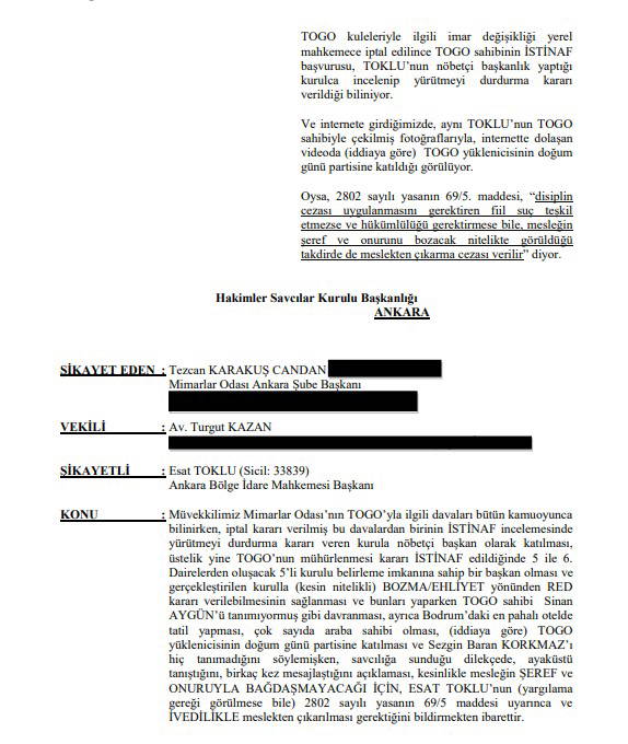 “Müvekkilimiz Mimarlar Odası’nın TOGO’yla ilgili davaları bütün kamuoyunca bilinirken, iptal kararı verilmiş bu davalardan birinin istinaf incelemesinde yürütmeyi durdurma kararı veren kurula nöbetçi başkan olarak katılması, üstelik yine TOGO’nun mühürlenmesi kararı istinaf edildiğinde 5 ile 6. Dairelerden oluşacak 5’li kurulu belirleme imkanına sahip bir başkan olması ve gerçekleştirilen kurulla (kesin nitelikli) bozma/ehliyet yönünden RED kararı verilebilmesinin sağlanması ve bunları yaparken TOGO sahibi Sinan Aygün’ü tanımıyormuş gibi davranması, ayrıca Bodrum’daki en pahalı otelde tatil yapması, çok sayıda araba sahibi olması, (iddiaya göre) TOGO yüklenicisinin doğum günü partisine katılması ve Sezgin Baran Korkmaz’ı hiç tanımadığını söylemişken, savcılığa sunduğu dilekçede, ayaküstü tanıştığını, birkaç kez mesajlaştığını açıklaması, kesinlikle mesleğin şeref ve onuruyla bağdaşmayacağı için, Esat Toklu’nun (yargılama gereği görülmese bile) 2802 sayılı yasanın 69/5 maddesi uyarınca ve İVEDİLİKLE meslekten çıkarılması gerektiğini bildirmekten ibarettir.”