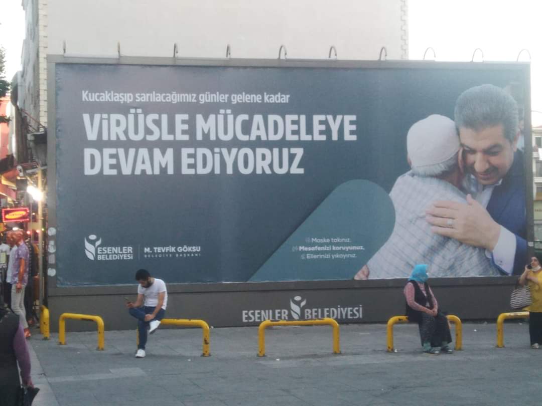 Esenler Belediye Başkanı Tevfik Göksu, Esenler'in birçok noktasına koronavirüsle mücadele afişleri astırdı. Afiş görselinde, maskesiz ve bir şekilde vatandaşla sarıldığı görülen Göksu, tepki çekti.