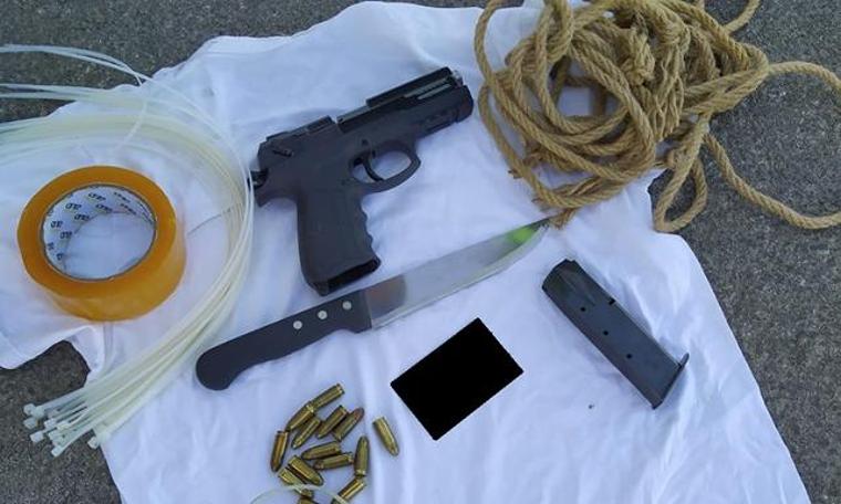 M.A.'nın yapılan üst aramasında, 9 milimetre çapında tabanca, bu silaha ait 14 mermi, 28 santimetre uzunluğunda bıçak, 10 plastik kelepçe, 1'er metre olarak kesilmiş, uçları düğümlü 5 kendir ip ve koli bandı ele geçirildi.