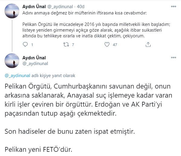 Pelikan Örgütü ile mücadeleye 2016 yılı başında milletvekili iken başladım; listeye yeniden girmemeyi açıkça göze alarak, aşağılık itibar suikastleri altında bu tehlikeye ısrarla ve inatla dikkat çektim, çekiyorum.