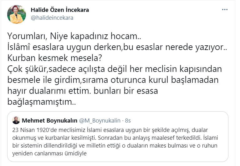 Eski AKP Milletvekili Halide Özen İncekara, istifa eden Ayasofya Başimamı Mehmet Boynukalın’a tepki gösterdi. Mehmet Boynukalın, sosyal medyada “23 Nisan 1920'de meclisimiz İslami esaslara uygun bir şekilde açılmış, dualar okunmuş ve kurbanlar kesilmişti. Sonradan bu anlayış maalesef terkedildi. İslami bir sistemin dillendirildiği ve milletin ettiği o duaların makes bulması ve o ruhun yeniden canlanması ümidiyle” mesajını yayımladı.