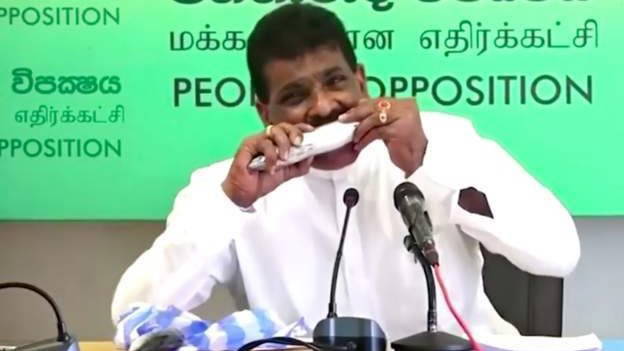 Sri Lanka'da eski Balıkçılık Bakanı Dilip Wedaarachchi, koronavirüs bulaşmadığını kanıtlamak için basın toplantısında çiğ balık ısırdı.