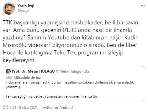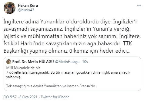 Halen Erciyes Üniversitesi Edebiyat Fakültesi Tarih Bölümü'nde öğretim üyeliği görevinde bulunan Metin Hülagü, "Milli Mücadele'de biz 7 düvelle falan savaşmadık. Bu tür masalları çocukken dinlemiştik ama anladık yalanmış. Tek savaştığımız devlet Yunanistan ve kısmen Fransa'dır" diye yazdı.