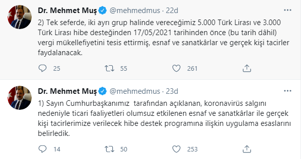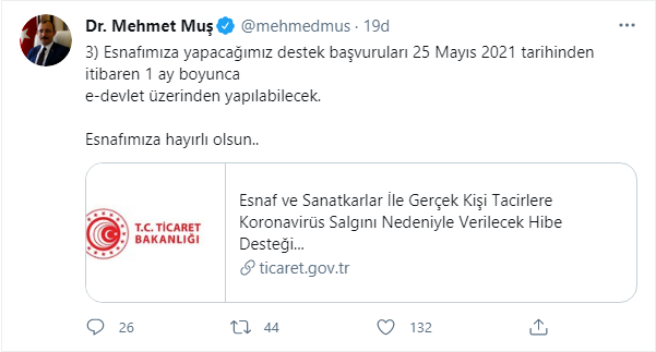 Ticaret Bakanı Mehmet Muş, "Esnafımıza sağlayacağımız destek için başvurular 25 Mayıs'tan itibaren 1 ay boyunca e-Devlet üzerinden yapılabilecek" açıklaması yaptı.