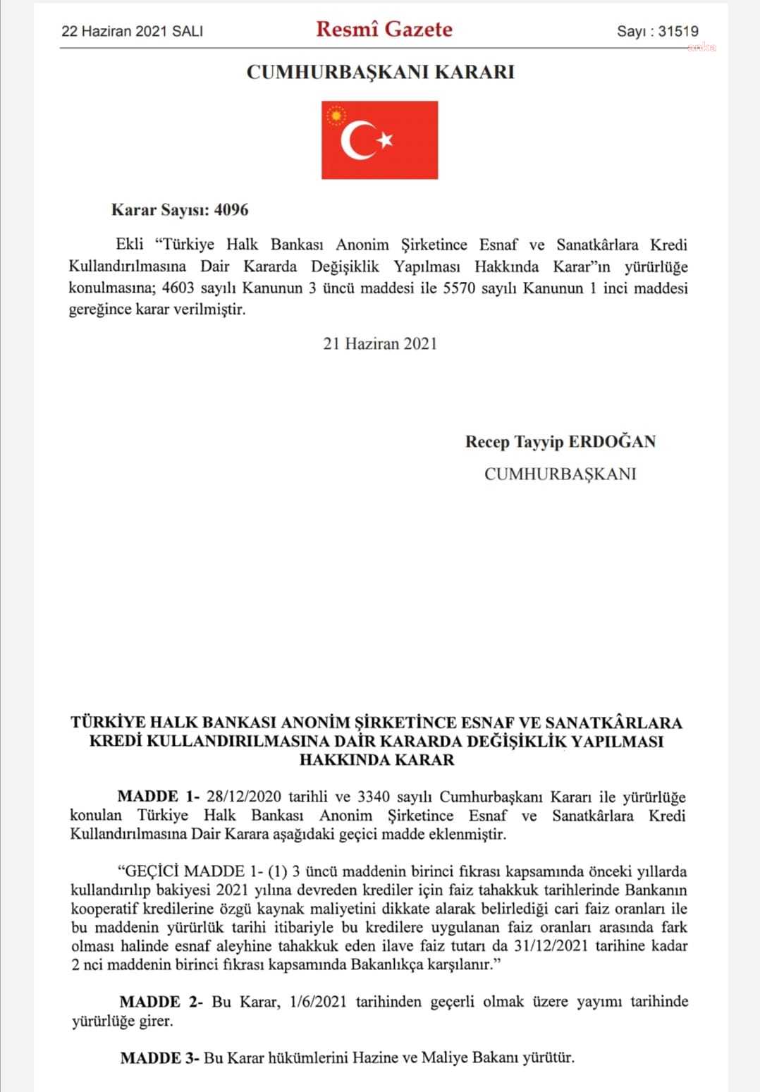 Türkiye Halk Bankası Anonim Şirketince Esnaf ve Sanatkarlara Kredi Kullandırılmasına Dair Kararda Değişiklik Yapılması Hakkındaki Cumhurbaşkanlığı Kararı Resmi Gazete'de yayımlandı. Karar, 1 Haziran'dan itibaren geçerli olmak üzere yürürlüğe girdi.