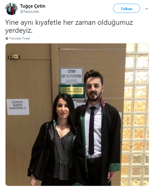 Odatv'de yer alan habere göre; sosyal medya hesabından fotoğrafını paylaşan Tuğçe Çetin, paylaşımına, "Yine aynı kıyafetle, her zaman olduğumuz yerdeyiz" notunu düştü.