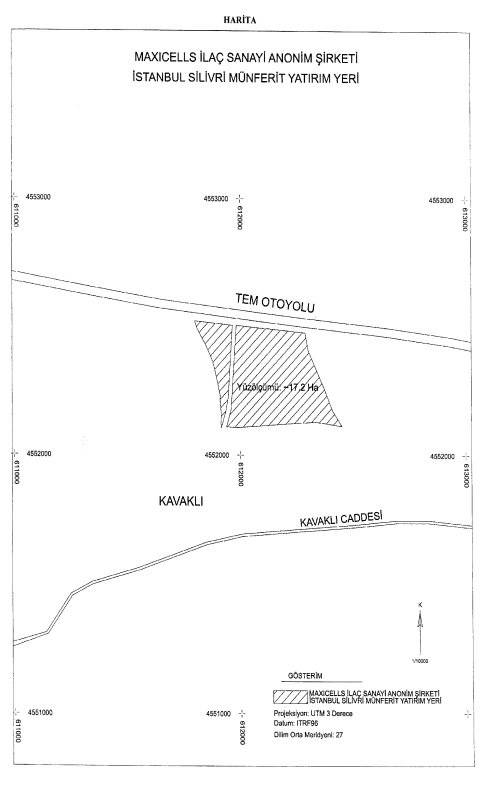Resmi Gazete’de yayımlanan kararda şu ifadeler kullanıldı: "İstanbul ili, Silivri ilçesinde bulunan ve ekli haritada sınırları gösterilen alan, Maxicells İlaç Sanayi Anonim Şirketine münferit yatırım yeri olarak tahsis edilmiştir. Söz konusu yatırımcı tarafından Sanayi ve Teknoloji Bakanlığı Merkez Saymanlık Müdürlüğü hesabına yatırılacak tutar, sabit yatırım tutarının binde biri olarak belirlenmiştir."