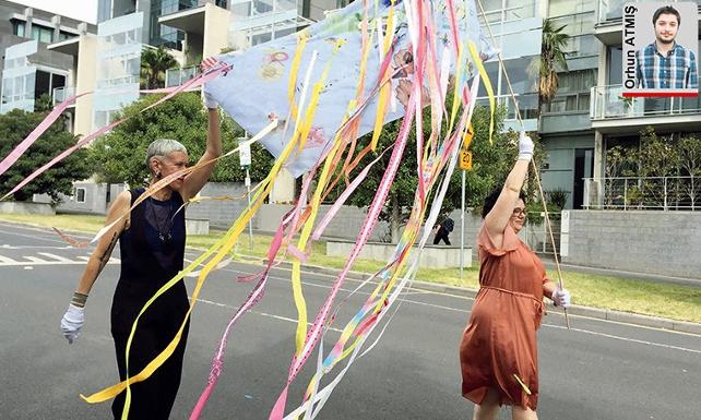 Linda Dement ve Nancy-Mauro Flude, sergiye Bir Bayragˆa Dönüs¸türülmüs¸ Siberfeminist Çars¸af posterleriyle katılıyor. Siberfeminist Çarşaf, Linda’nın punk, siberfeminizm ve isyan pratiklerine dair kişisel bir jeneoloji ortaya koymak ve bir topluluğu imgeler ile bedensel ve düşünsel izler üstünden inşa etmek arzusundan yola çıkar. Nancy ile birlikte “çarşaf”ı bir bayrağa dönüştürler ve bu bayrakla bir yürüyüşe katılırlar. Çarşafın bedene ve temasa dair izlerini hazla üstlenen sanatçılar, siberfeminizm bedenle ilgilenme biçimlerine, feminist dayanışma pratiklerine ve bu pratiklerin iyileştiren ve güç veren imkanlarını keşfetmeye dair bir çağrıda bulunuyor.