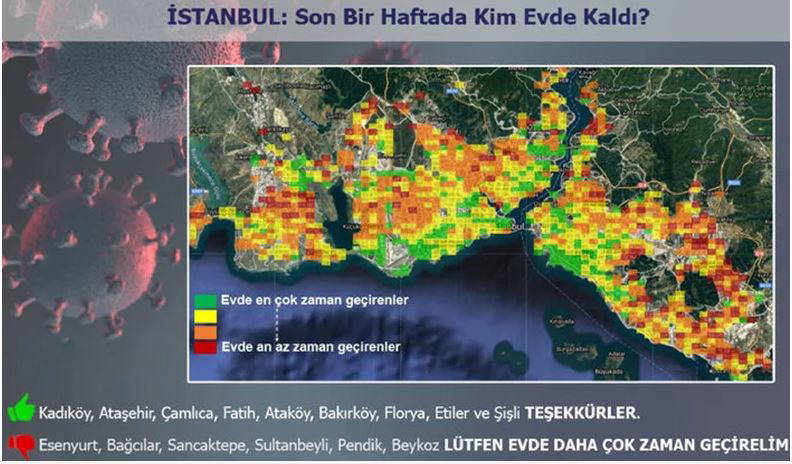 Veloxity’nin yaptığı araştırmaya göre 17 Mart’tan başlayarak 7 gün boyunca en fazla evde kalan İstanbul semtleri; Kadıköy, Ataşehir, Çamlıca, Fatih, Ataköy, Bakırköy, Florya, Etiler ve Şişli oldu. En az evde kalan İstanbul semtleri ise Esenyurt, Bağcılar, Sancaktepe, Sultanbeyli, Pendik, Beykoz oldu.