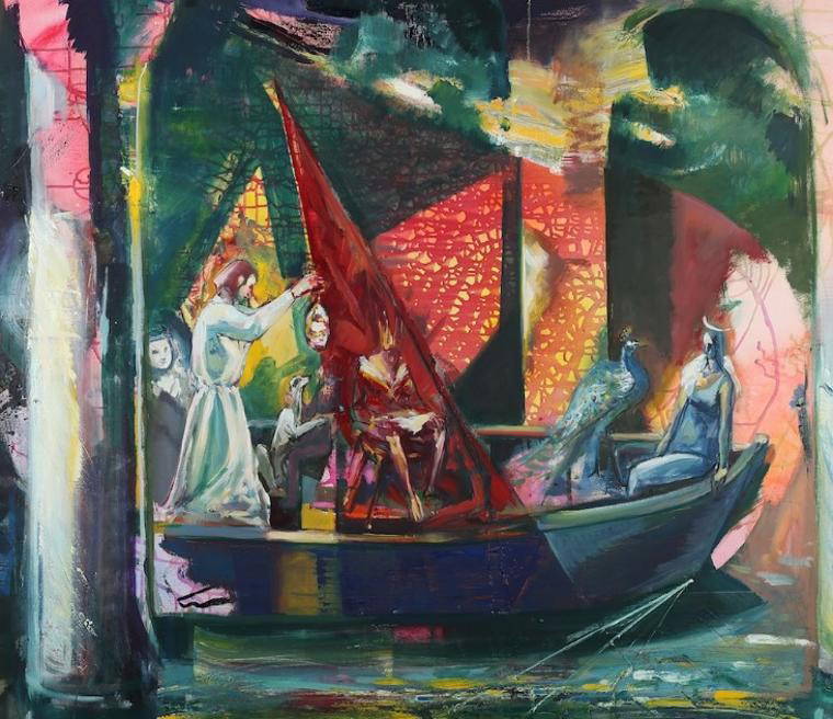 Turan bu sergideki işlerini oluk, su yolu anlamına gelen “Ark” başlığı altında topluyor. Tuvallerinin zeminini boyarken kullandığı ve ‘‘yerçekimi geometrisi’’ olarak adlandırdığı tekniğiyle, İstanbul’un binlerce yıllık geçmişindeki “su” olgusuna odaklanıyor.