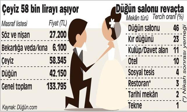 Kur ve enflasyondaki yükselişin çeyiz ve düğün maliyetlerini de artırdığını söyleyen dügün.com Üst Yöneticisi (CEO) Emek Kırbıyık, şunları anlattı: “Fiyatlardaki yükselmenin nedeni hizmet alanındaki zamdan çok, ürün veya malzemelerin maliyetinin yükselmesinden kaynaklandı. Bu yüzden yalnızca son bir yılda çeyiz, düğün ve balayı harcamalarında 30 bin TL’lik bir artış yaşandı. Söz-nişan, bekârlığa veda ya da kına gecesi organizasyonu gibi düğün organizasyonu dışındaki ekstra harcamaları hesaba katmazsak, 2019’da bir çiftin evlenebilmesi için yaklaşık 100 bin TL’yi gözden çıkarması gerekiyor.”