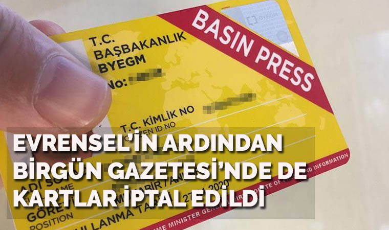 Başkanlık sistemine geçişle Basın Kartları Komisyonu’nun Cumhurbaşkanlığı’na bağlanması ardından muhalif gazetecilerin ‘basın kartları’ birer birer iptal ediliyor. Evrensel gazetesinde çalışan gazetecilerin ardından Birgün gazetesinde çalışan gazetecilerin de kartları iptal edildi. Aylardır devam eden ‘basın kartı değişiklik çalışması’ boyunca sürecin neden bu kadar uzadığına dair İletişim Başkanlığı’ndan Birgün gazetesine hiçbir bilgilendirme yapılmazken, süreç sonunda ise bazı çalışan, yazar ve yöneticilerin basın kartları iptal edildi. Söz konusu iptal hakkında herhangi bir resmi bildirim yapılmadı.