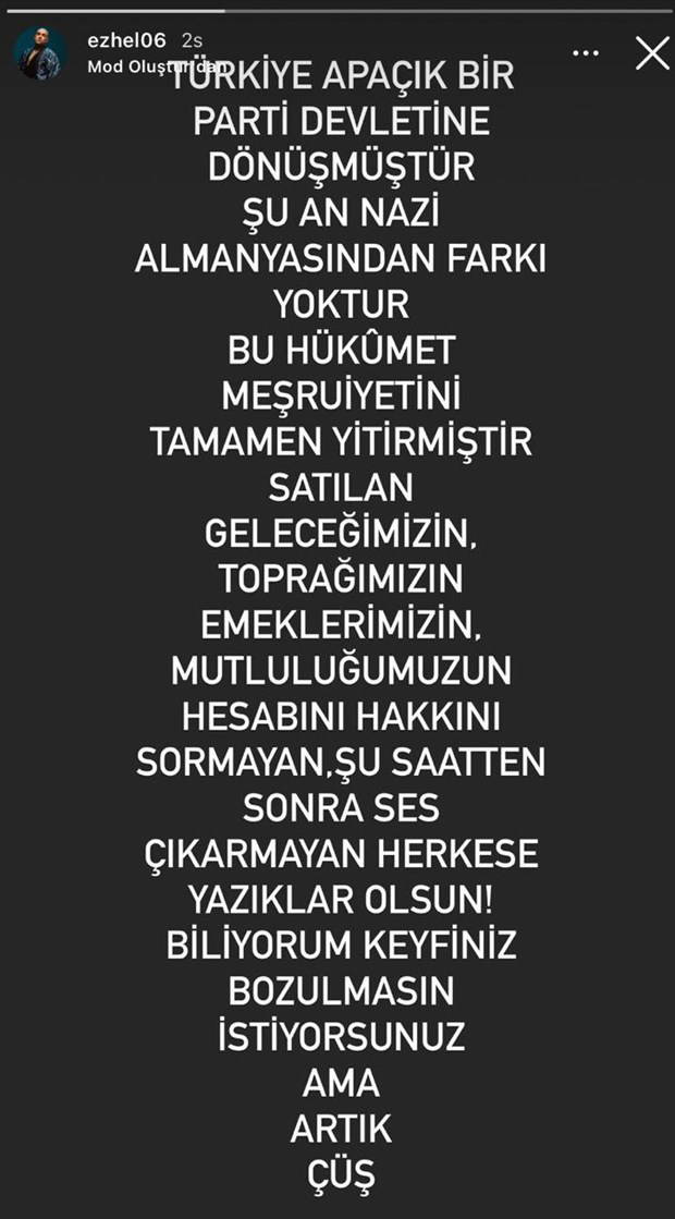Gerçek adı Sercan İpekçioğlu olan ünlü rapçi Ezhel, “Türkiye’nin şu an Nazi Almanyası’ndan farkı yok” dedi. Almanya’da yaşayan İpekçioğlu, Instagram paylaşımında, Türkiye’nin ‘apaçık bir parti devletine dönüştüğünü’ ifade ederek, “Bu hükümet meşruiyetini tamamen yitirmiştir” dedi.
