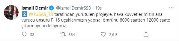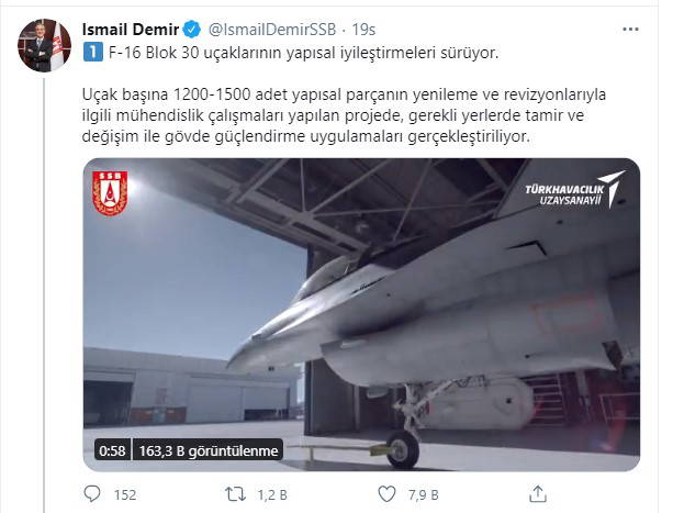 Cumhurbaşkanlığı Savunma Sanayii Başkanı İsmail Demir, Twitter hesabından yaptığı paylaşımda, F-16 Blok 30 uçaklarının yapısal iyileştirmelerinin sürdüğünü bildirdi.