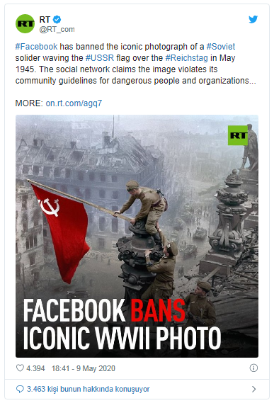 Facebook, 9 Mayıs Zafer Günü’nde, İkinci Dünya Savaşı’nı kapatan meşhur Reichstag’a dikilen kızıl bayrak fotoğrafını “topluluk standartlarına uymadığı” gerekçesiyle yasakladı.