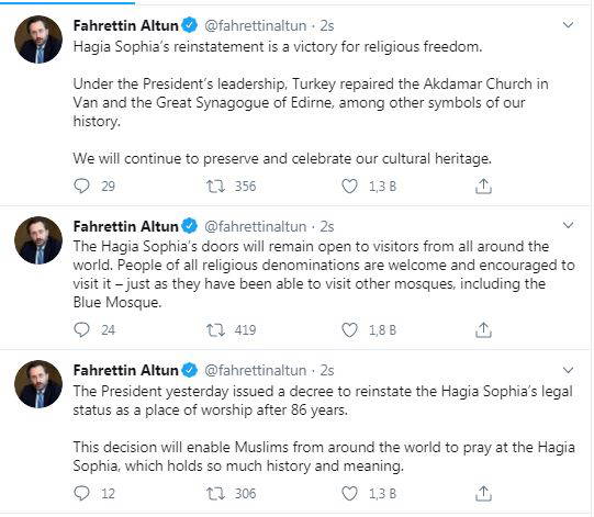 İletişim Başkanı Altun, Ayasofya'nın yeniden ibadete açılmasına ilişkin sosyal paylaşım sitesi Twitter'daki hesabından açıklama yaptı. Altun, İngilizce yaptığı açıklamasında, Cumhurbaşkanı Recep Tayyip Erdoğan'ın, Ayasofya Camisi'ni 86 yılın ardından yeniden ibadete açan kararnameyi imzaladığını anımsatarak, şunları söyledi: