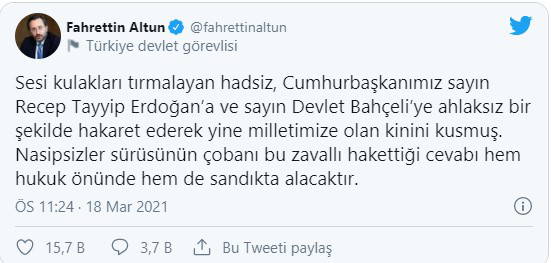 Özgür Özel'e yine Twitter'dan cevap veren Cumhurbaşkanlığı İletişim Başkanı Fahrettin Altun ise çok sert ifadeler kullandı. Altun, "Sesi kulakları tırmalayan hadsiz, Cumhurbaşkanımız Sayın Recep Tayyip Erdoğan'a ve Sayın Devlet Bahçeli'ye ahlaksız bir şekilde hakaret ederek yine milletimize olan kinini kusmuş. Nasipsizler sürüsünün çobanı bu zavallı hak ettiği cevabı hem hukuk önünde hem de sandıkta alacaktır" dedi.