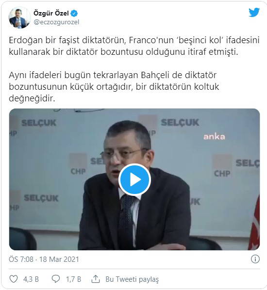 Erdoğan bir faşist diktatörün, Franco’nun ‘beşinci kol’ ifadesini kullanarak bir diktatör bozuntusu olduğunu itiraf etmişti. Bu arkadaş da (Bahçeli) diktatör bozuntusunun küçük ortağıdır, küçük diktatördür. Partisinde diktatördür, Türkiye’de de bir diktatörün koltuk değneğidir."