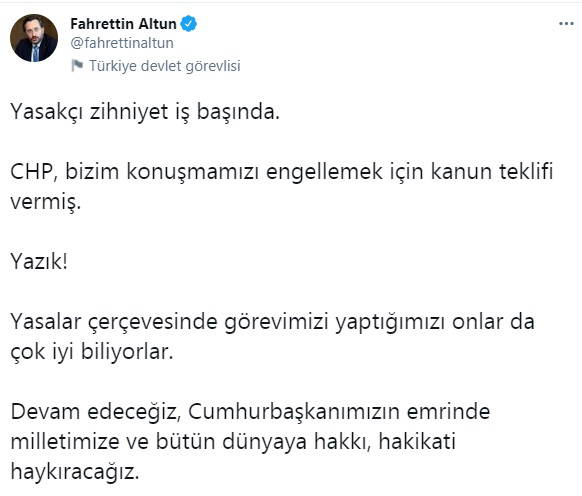 İletişim Başkanı Altun, CHP'nin İletişim Başkanlığı ile ilgili TBMM'ye verdiği kanun teklifi hakkında Twitter hesabından açıklama yaptı. Altun, yaptığı açıklamada, "Yasakçı zihniyet iş başında. CHP, bizim konuşmamızı engellemek için kanun teklifi vermiş. Yazık. Yasalar çerçevesinde görevimizi yaptığımızı onlar da çok iyi biliyorlar. Devam edeceğiz, Cumhurbaşkanımızın emrinde milletimize ve bütün dünyaya hakkı, hakikati haykıracağız" dedi.