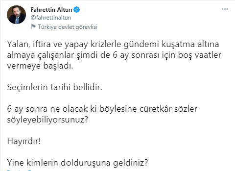 Fahrettin Altun'un "Düzelecek ne var?" diye sormaktansa "Neden 6 ay sonrasına vaat veriyorsunuz?" sorusunu sorması ise dikkat çekti.