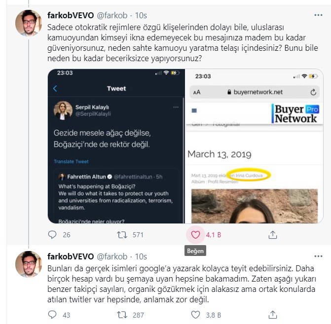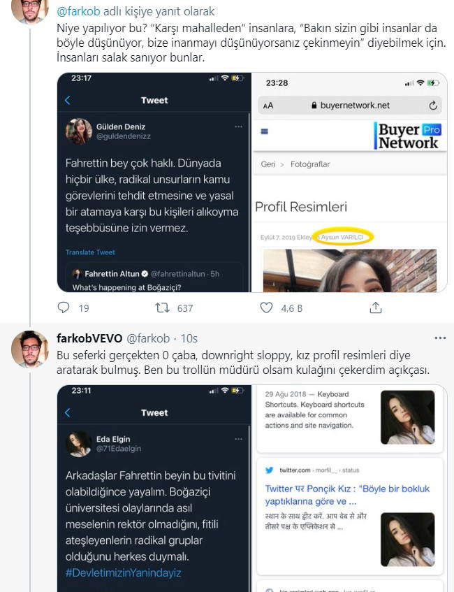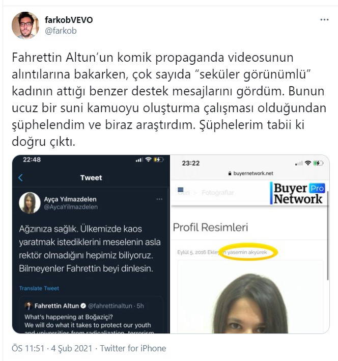 Bu profillerin araştırılması sonucunda, hesapların sahte olduğu ortaya çıktı. “farkobVEVO” adlı Twitter kullanıcısı, “buyernetwork” sitesinden profil fotoğraflarının alındığını ve sahte hesaplar açıldığını tespit etti.