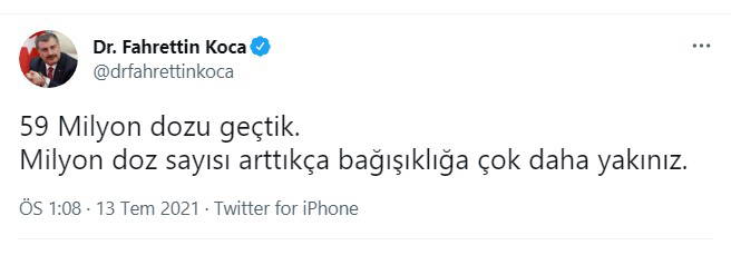Sağlık Bakanı Koca da Twitter'daki hesabından yaptığı açıklamada, aşıda 59 milyon dozu geçtiklerini duyurdu. Koca, "Milyon doz sayısı arttıkça bağışıklığa çok daha yakınız" dedi.