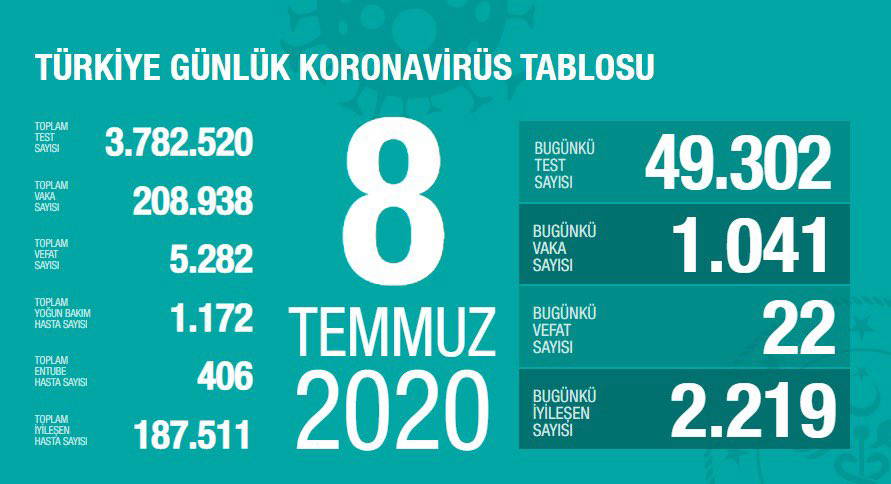 İyileşen sayısının bugün hastalığı atlatan 2 bin 219 kişiyle birlikte 187 bin 511'e yükseldiği Türkiye'de bin 172 yoğun bakım hasta sayısı, 406 entübe hasta sayısı bulunuyor.