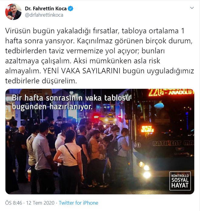 ''Virüsün bugün yakaladığı fırsatlar, tabloya ortalama 1 hafta sonra yansıyor. Kaçınılmaz görünen birçok durum, tedbirlerden taviz vermemize yol açıyor; bunları azaltmaya çalışalım. Aksi mümkünken asla risk almayalım. YENİ VAKA SAYILARINI bugün uyguladığımız tedbirlerle düşürelim''