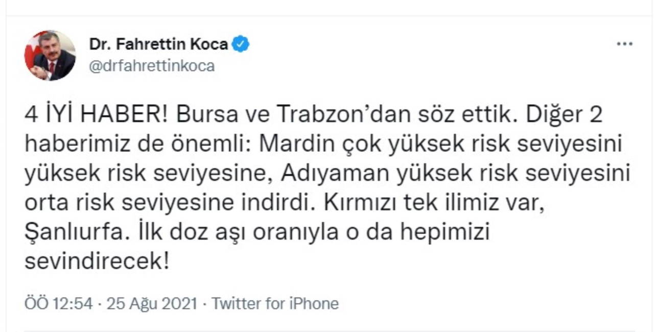 Bakan Koca, Twitter hesabından yaptığı paylaşımda, Trabzon ve Bursa'da aşılanmanın yüzde 75'i geçtiğini ve mavi kategorideki iller arasında yer aldığını hatırlatarak, Mardin'in "çok yüksek risk" (kırmızı) seviyesini "yüksek risk" (turuncu) seviyesine, Adıyaman'ın ise "yüksek risk" (turuncu) seviyesini "orta risk" (sarı) seviyesine indirdiğini belirtti.