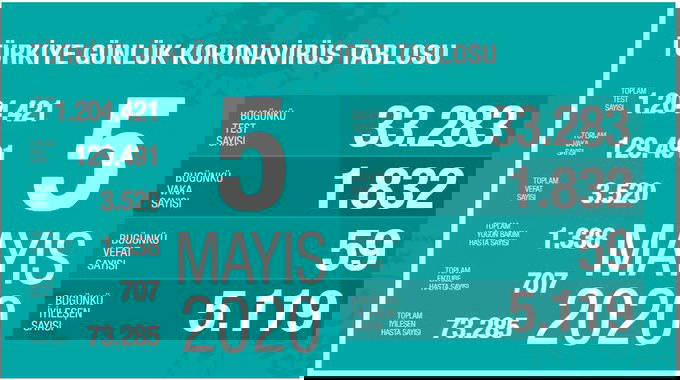 Sağlık Bakanı Koca, son 24 saatte 59 kişinin daha yaşamını yitirdiğini, bin 832 yeni vakanın olduğunu açıkladı. Toplam ölü sayısı 3 bin 520'e yükselirken, koronavirüs vaka sayısı ise 129 bin 491'e yükseldi. Bugün iyileşen kişi sayısı se 5 bin 119 oldu.