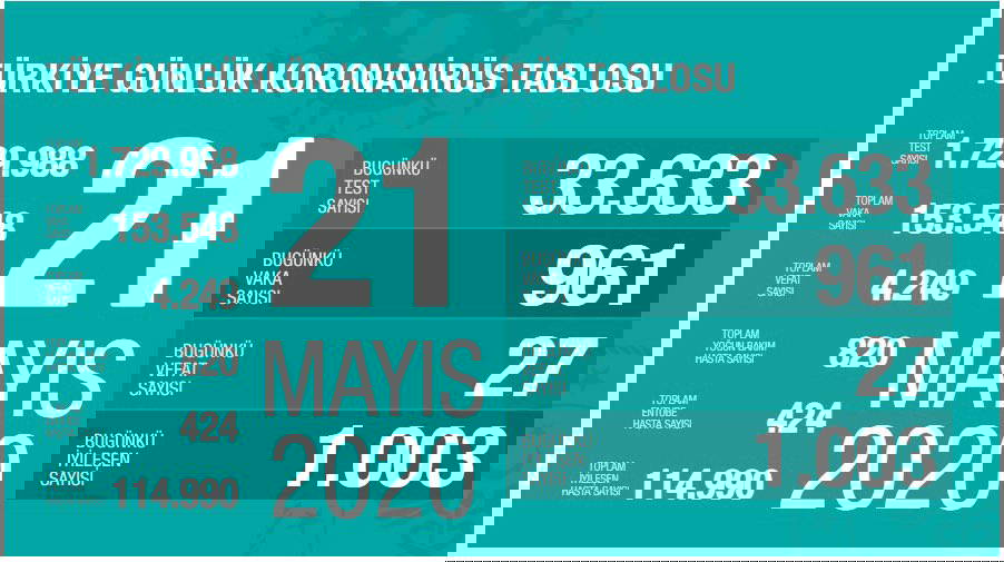 Türkiye'de son 24 saatte tespit edilen yeni koronavirüs vaka sayısı ise ikinci kez binin altında seyredek 961 oldu. Ülkede ilk günden bu yana toplamda 153 bin koronavirüs vakası tespit edildi. Tespit edilen vakaların 114 bin 990'ı hastalığı atlatarak taburcu oldu.