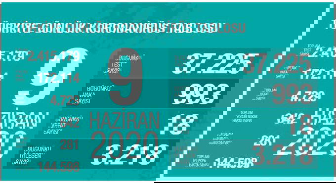 Sağlık Bakanı Fahrettin Koca, 9 Haziran 2020 tarihli koronavirüs tablosunu paylaştı. Koca, Türkiye'de koronavirüs nedeniyle 18 yurttaşın daha yaşamını yitirdiğini açıkladı. Bakan Koca, ayrıca yaptığı açıklamada 993 yeni vakanın tespit edildiği bilgisini verdi. Koronavirüs nedeniyle 4 bin 729 kişi yaşamını yitirirken, koronavirüs vaka sayısı 172 bin 114'e yükseldi. Bugün iyileşen sayısı 3 bin 218 oldu.