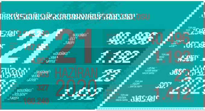 Sağlık Bakanı Fahrettin Koca, 21 Haziran 2020 tarihli koronavirüs tablosunu paylaştı. Koca, Türkiye'de koronavirüs nedeniyle 23 yurttaşın daha yaşamını yitirdiğini açıkladı.