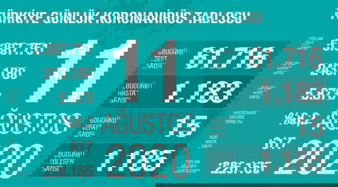 Türkiye'nin 11 Ağustos 2020 koronavirüs tablosu şöyle: