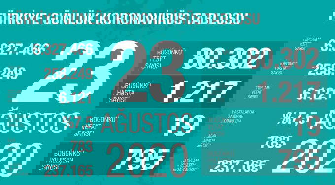 Türkiye'nin 23 Ağustos 2020 koronavirüs tablosu şöyle: